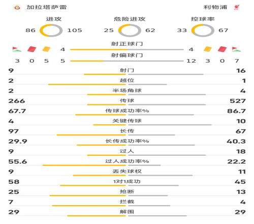雷速体育10月1日宣 欧冠联赛阶段次轮,加拉塔萨雷主场以1-0力克利物浦爆出冷门。这场比赛里,利物浦在进攻端呈现彻底碾压对手的态势,但却陷入到得势不得分的困境之中,无奈吞下失利的苦涩滋味。 纵观全场比赛,利物浦在射门方面以16-9明显高出对手,但其中射门方面双方皆是4次平分秋色。在控球率方面,利物浦则以67%-33%明显高出对手。 在传球数上,利物浦以527-266明显高出对手;在传球成功率方面,利物浦则以86.7%-67.7%占据着明显优势,其中在关键传球的数据上,利物浦则以10-4占优。在过人方面,利物浦也以18-9占据优势,但过分成功率方面,反倒是加拉塔萨雷以55.6%-22.2%领先。 在防守端的数据上,则是加拉塔萨雷占据优势,在抢断方面以25-13领先,拦截方面以7-4占优,解围双方皆是29次。 技术统计 |