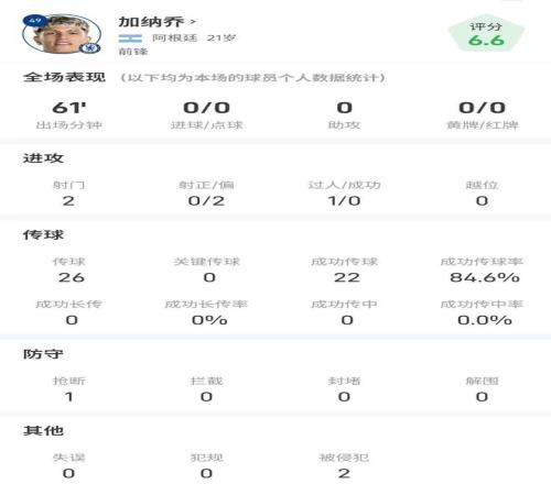 造乌龙!加纳乔全场数据:2次射门,传球成功率84.6%