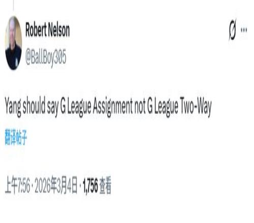 开拓者官方的错误,很快被一位名为Nelson的球迷指出,他写道:“杨瀚森是下放发展联盟,而不是发展联盟双向合同。”随后,一位Buka的球迷与Nelson在评论区展开热议。 Buka写道:“耐心已经耗尽了,这意味着杨瀚森已经被开拓者放弃,可能会在休赛期被交易。”Nelson回应道:“你们冷静点,他只是个20岁的新秀,横跨半个地球来打最高水平的联赛。而且不管怎样,事实就是官方公关发错了,他只是下放发展联盟,却写成了双向合同。”