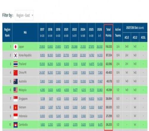 在2025-26赛季,三支出战亚冠精英联赛的中超球队分别排名东亚区后三位,未能跻身淘汰赛。出战亚冠二级联赛的北京国安同样在小组垫底,未能晋级淘汰赛。 四支中超球队集体出局之后,中超本赛季亚冠技术积分仅得到7.383分。而在柴桢晋级亚洲挑战者联赛半决赛之后,亚冠技术积分已经达到8.475分,从而超越了中超。 柬埔寨