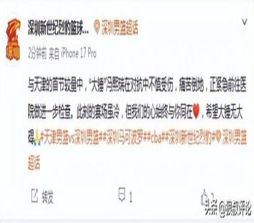 | 北京时间3月18日,深圳男篮对阵天津男篮的比赛当中,小将冯熙瑞在首节受伤离场引发外界的热议。 不久前,深圳男篮官方发文:与天津的首节较量中,“大锤”冯熙瑞在对抗中不慎受伤,痛苦倒地,正紧急前往医院做进一步检查。此刻的赛场虽冷,但我们的心始终与你同在[心],希望大锤无大碍。 不少媒体人送出祝福:冯熙瑞这个伤有点恐怖,保佑小伙子。 由于图片可能引人不适,外界并没有暴露出太多细节,但从当时的回放可以看到是非常严重的伤病。 不少球迷同样送出祝福,保佑啊 才打第二场。 根据CBA官方的公示,冯熙瑞今年只有19岁,身高2米14,体重98公斤,今年是生涯首个赛季,此役也是第二场常规赛。 2026年3月16日,深圳对阵广州的比赛,冯熙瑞出战14分钟,投篮1中1,得到2分2篮板1助攻,完成CBA生涯首秀。 |