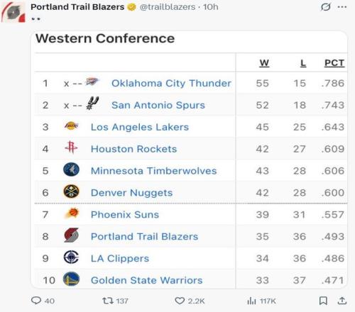 开拓者拿到三连胜,而快船吞下4连败,勇士队最近的21场比赛输掉了16场,开拓者已经反超快船升至西部第八,开拓者已经领先勇士1.5个胜场,开拓者近来状态真的不错。