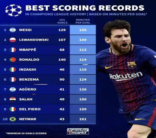 欧冠历史进球效率榜!虽然C罗进球排名第一但效率比梅西低不少