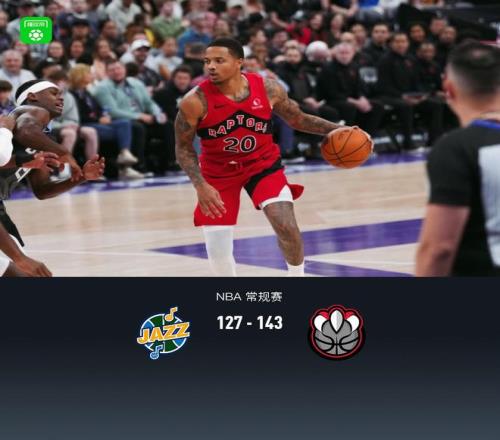 第一节爵士孔查尔拿下8分,猛龙斯科蒂-巴恩斯拿下7分,首节战罢爵士25-31落后猛龙 第二节爵士埃斯-贝利拿下13分,猛龙马穆凯拉什维利拿下10分,半场结束爵士58-68落后猛龙 第三节爵士埃斯-贝利拿下10分,猛龙RJ-巴雷特拿下18分,第三节结束爵士88-117落后猛龙 第四节爵士森萨博拿下10分,猛龙贾米森-巴特尔拿下6分,最终爵士127-143不敌猛龙