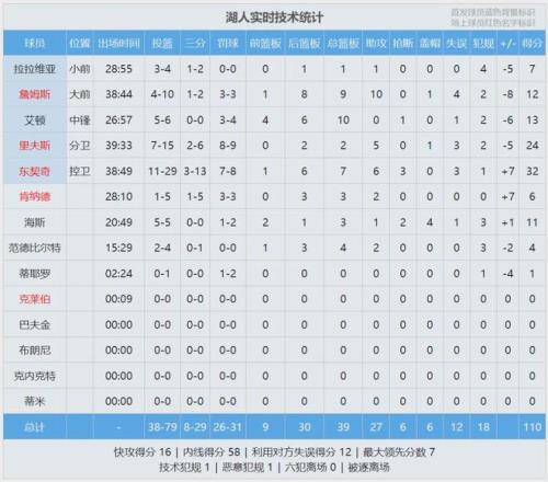 末节最后40秒,艾顿2罚2中帮湖人反超1分。活塞又是詹金斯站出来,上篮造犯规同样2罚2中。湖人暂停,里夫斯单打詹金斯,湖人再次反超。詹金斯今天爆了,在里夫斯面前急停跳投打进。东契奇金鸡独立打铁,湖人只能犯规了。 詹金斯2罚2中,最后9秒活塞领先3分。湖人边线球差点失误,东契奇把球捡回来,但是湖人战术被破坏。杜伦紧贴东契奇,后者超远三分三不沾。全场结束,活塞113-110终结了湖人9连胜!詹金斯30分4板8助、杜伦20分11板。 詹金斯包揽了活塞最后7分,单场30分创造个人生涯新高!他的合同2年780万美元,本赛季薪水只有400万。东契奇32分7板6助3断、里夫斯24分2板5助、詹姆斯12分9板10助。最后看看数据: