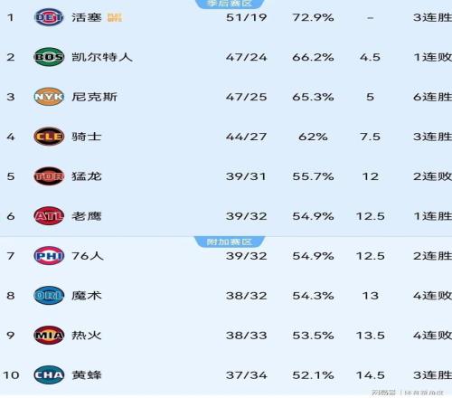 当前,在东部常规赛战绩上排在猛龙队前面的球队分别是活塞队(51胜19负)、凯尔特人队(47胜24负)、尼克斯队(47胜25负)和骑士队(44胜27负)。 |